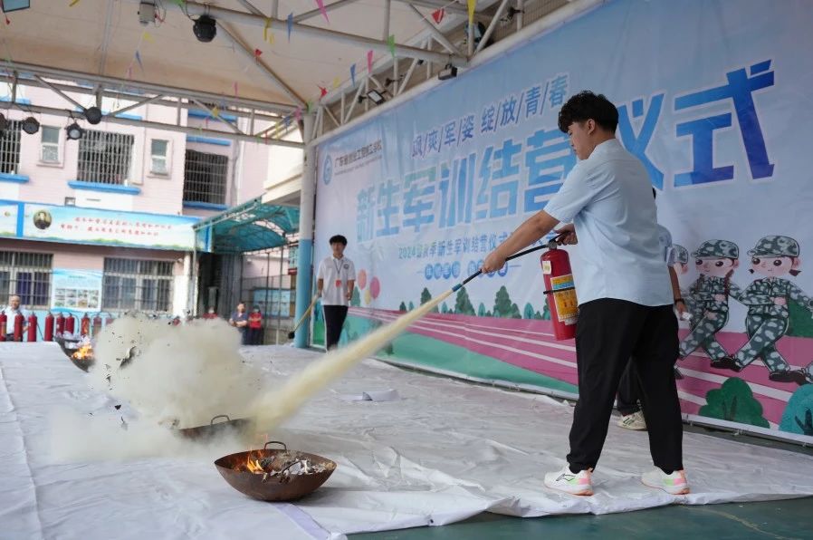 学以致用。教师与学生代表操作灭火器,进行灭火。