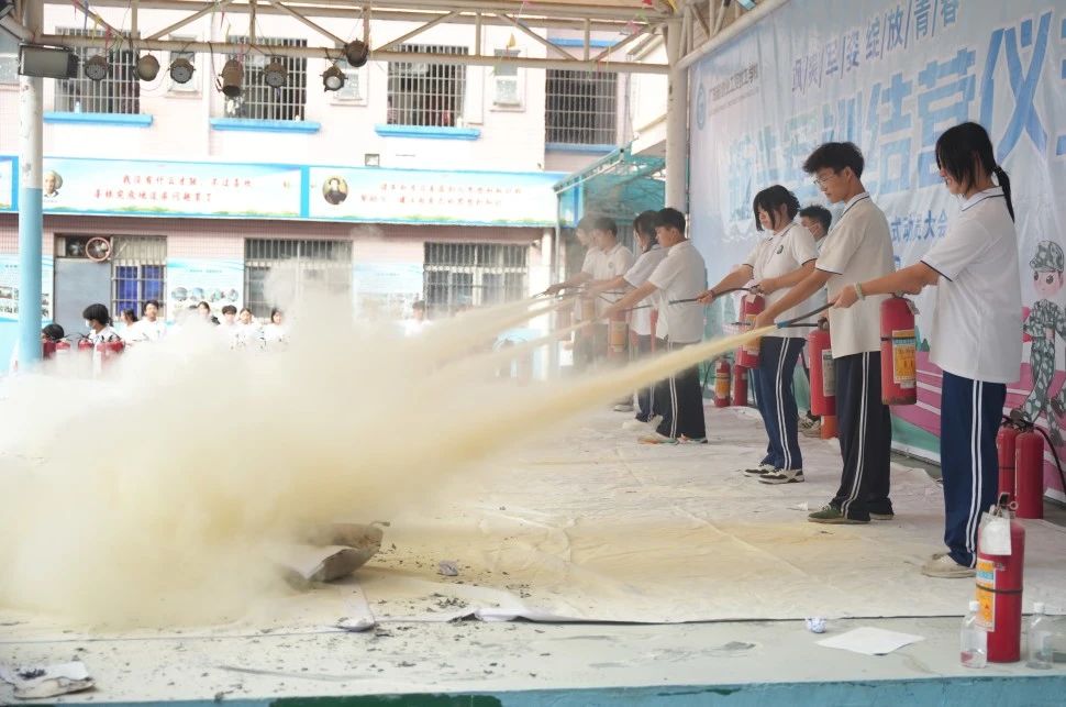 学以致用。教师与学生代表操作灭火器,进行灭火。