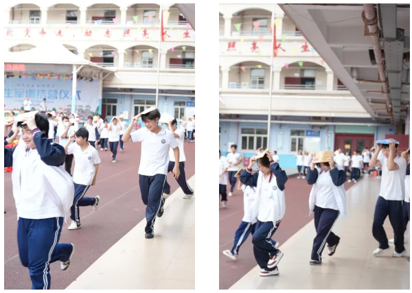 教师组织学生按预定路线迅速、有序撤离教室。疏散引导的教师在关键位置有序引导学生双手护头、弯腰低姿前行到达集合地点。演练中,学生安静、有序、快速疏散,到达指定位置后,班主任及时清点人数。