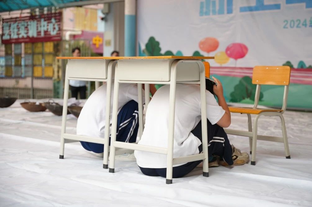 信号员发出“地震警报”信号后,全体师生立即停止教学活动,进入紧急避震状态,教师迅速指挥学生躲在安全位置,保护头部和颈部。